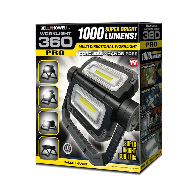 Bell + Howell Work Light 360 PRO is the powerful multi-position mega task light that puts the light where you need it, at the right time every time. Easy to use, press it once for maximum dual lighting action and twice for a single light use. Work Light 360 Pro features exclusive ratchet lock action to lock virtually into any position possible. To make your life easier for any task at hand. Best of all Work Light 360 Pro is ultra-light for easy carry, water resistant so you never have to worry about getting it wet and construction grade sturdy, so you don’t have to worry about dropping it.