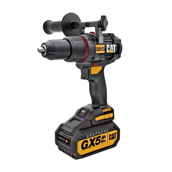The Cat DX13 cordless hammer drill with brushless motor and graphene battery uses advanced technology and design to enhance power and performance for pro-grade drilling projects. Supported by a durable 2-speed all-metal gear box, this drill can take on both standard and heavy-duty applications: use the low-speed setting that reaches up to 550 RPM or the high-speed setting that achieves up to 2200 RPM. For added productivity, use the clutch to switch between drill and hammer mode. The hammer mode can achieve a max impact rate of 35,200 BPM to seamless drill into concrete and masonry materials. Also use the clutch to adjust between 22 different torque levels up to a max torque of 700 in-lb to bore through any material—including wood and metal.