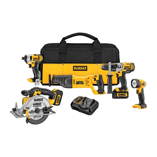 Complete various drilling projects with this DeWALT tool kit. This kit includes a hammer drill, reciprocating saw, impact driver, circular saw and LED work light. This lithium-ion tool kit comes with a fast charger and two batteries to reduce the downtime. Each tool’s power comes from a lithium-ion 20V max battery.
