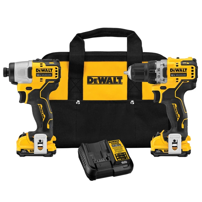 Choose this compact DeWALT cordless tools set for versatility. The cordless drill driver measures 5.97 in and suits precision drilling tasks such as pilot holes. Additionally, the kit has a cordless impact driver measuring 5.05 in and suits fastening jobs. The kit also has two 12V batteries and a charger, in a handy carry case.