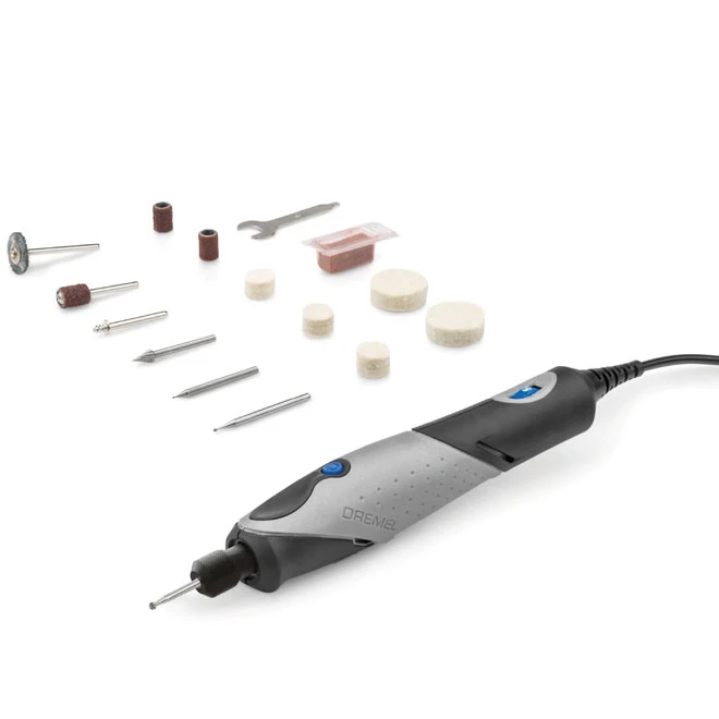 The Stylo+ by Dremel offers the precision you expect from a rotary tool. Crafted with the comfortable ergonomics of a pen, the narrow profile and soft grip allow creative users to etch, engrave, polish and sand with ease. You will enjoy an endless range of creative applications with this versatile craft tool. The tool/s variable speed ranges from 5,000 to 22,000 RPM, providing the optimal speed control for applications such as glass etching, leather burnishing, bead making, wood engraving and more. This product is backed by a 2-year warranty.