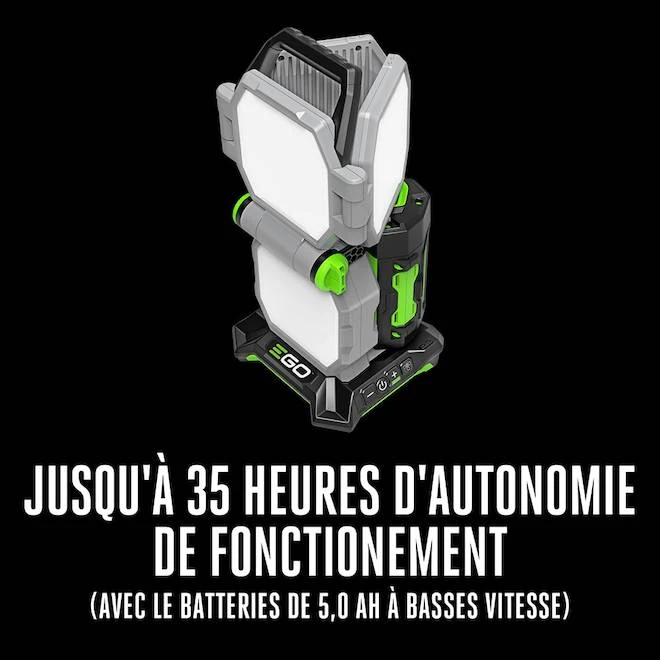 Introducing the EGO POWER+ Portable Area Light, the world’s most powerful area light in handheld cordless outdoor power. Illuminate any environment with 5 different brightness settings adjustable from 600-10,000 lumens. The POWER+ Portable Area light can be used as an ambient mood light, effective task light, and so much more. Activate boost mode for best in the class 10,000 lumens to illuminate large areas. With its compact design and integrated handle, easily store this light or take it on the go! Ideal for indoor and outdoor conditions with diffused panels for a softer light and weather resistant construction. This light is equipped with rafter hooks for hanging overhead and a tripod mount to cast light over an entire room. Get up to 35 hours of run time (on low with the recommended 5.0Ah ARC Lithium(TM) battery, available separately). Premium features like a USB A-Port come standard to make the experience unlike any other, allowing you to power or charge essential devices. Compatible with all EGO POWER+ ARC Lithium(TM) batteries (available separately) to deliver Power Beyond Belief(TM).