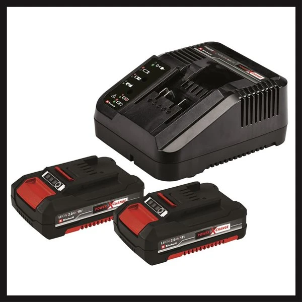 - This kit includes: 2 x 18 V 2.0 Ah batteries; charger, 18V ½-in cordless drill driver, 18 V ¼-in cordless impact driver and Einhell soft bag
