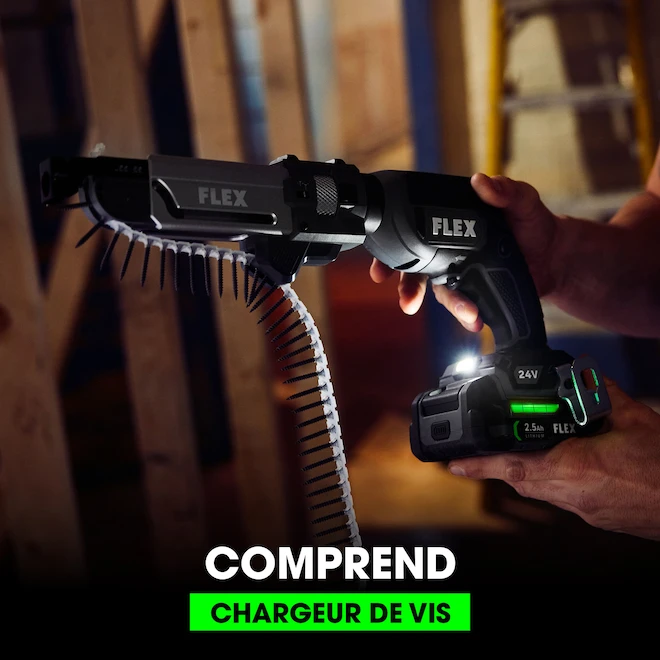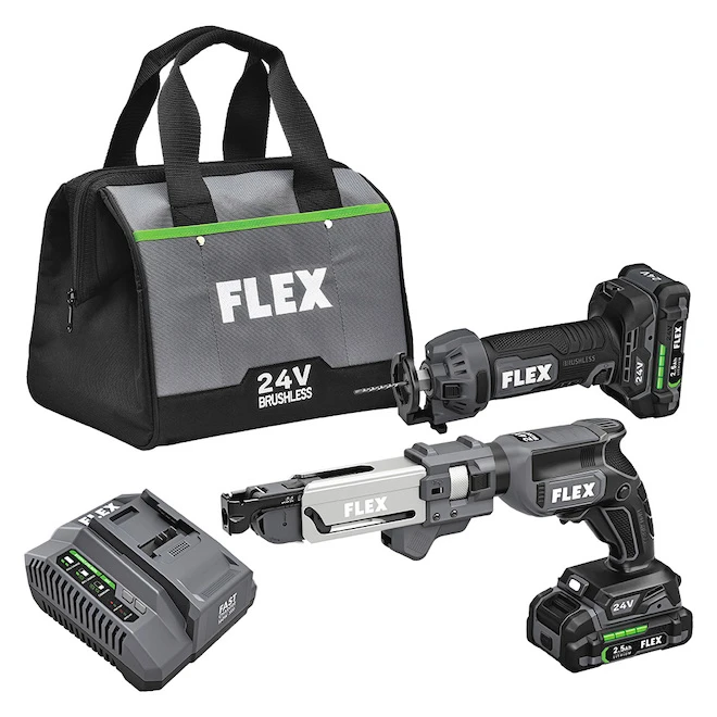 Dominate drywall from start to finish with the combined power and efficiency of the Flex drywall screw gun and Flex drywall cut-out tool. Features like the tool-less screw gun magazine attachment, lock-on switch, and adjustable dust controls help minimize disruptions that hamper productivity to help you get the job done faster. Total Flex 24 V cross-compatibility also means that these tools share the Flex Advantage of unrivalled 24 V battery power, runtime, and faster charging. This kit includes both tools, 2 2.5 Ah lithium-ion batteries, a 160 W fast charger and a soft carrying bag. Backed by a 5-year warranty.