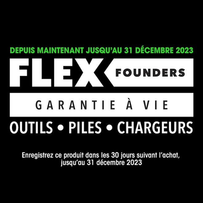 - FLEX FOUNDERS LIMITED LIFETIME WARRANTY: Register your new FLEX tool, battery or charger within 30 days of purchase through December 31, 2023 to receive a limited lifetime warranty on your new FLEX product