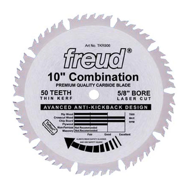 Handle a versatile range of tasks with this Freud circular saw blade. Use for ripping or cross cutting in plywood, chip board or dimensional lumber. Minimize risk of binding and kicking back with this anti-kickback saw blade. Leave a narrow cut and reduce power consumption with this thin kerf blade. This 10-inch circular saw blade has 50 teeth.
