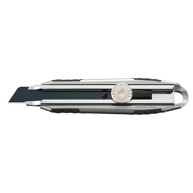 Cut out construction materials such as drywall easily and precisely with this Olfa pro utility knife. The durable die-cast handle features a non-slip grip for comfortable use. The black blade is 25% sharper than regular blades of the same brand and includes a stainless steel case as well as a solid metal ratchet lock. Finally, this cutter comes with a tethering hole for hands-free carrying. Warranty against any manufacturing defect.