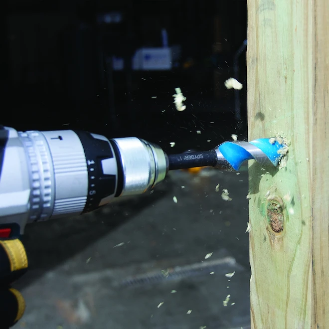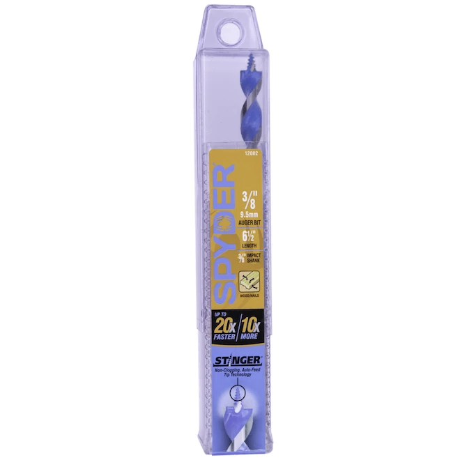 The Spyder Stinger(TM) auger bit features an innovative non-clogging, automatic-feeding precision tip for optimal speed, accuracy and no thrust drilling. Hardened cutting edges on this two-fluted bit run smoother than single-flute bits providing greater control and less vibration which makes them ideal for deep hole boring in nail embedded wood. Chuck them into your impacting tool for even greater drilling power.