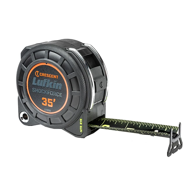 Lufkin® proposes a measuring tape made for superior legibility in any light condition, Shockforce(TM) Nite Eye Dual Sided Tape Measure features a high visibility green-on-matte black blade. Diamond-coated end hook grabs material from every direction and prevents slippage. Matte nylon blade provides extended product life and glare reduction. Optimized drum and spring design provide a compact case design that fits comfortably in the palm of your hand. Dual-sided blade print with vertical quick read scale on the underside of overhead and hard to reach measurements. Steel tether point offers increased safety capability when working at height and can also be used for scribing and drawing arcs during layout. Narrow blade technology offers reduced weight.
